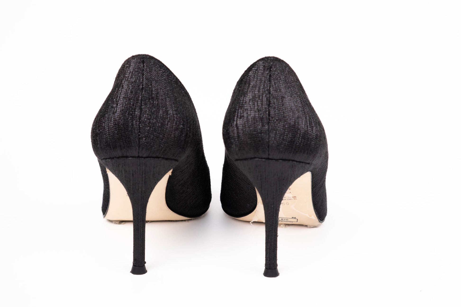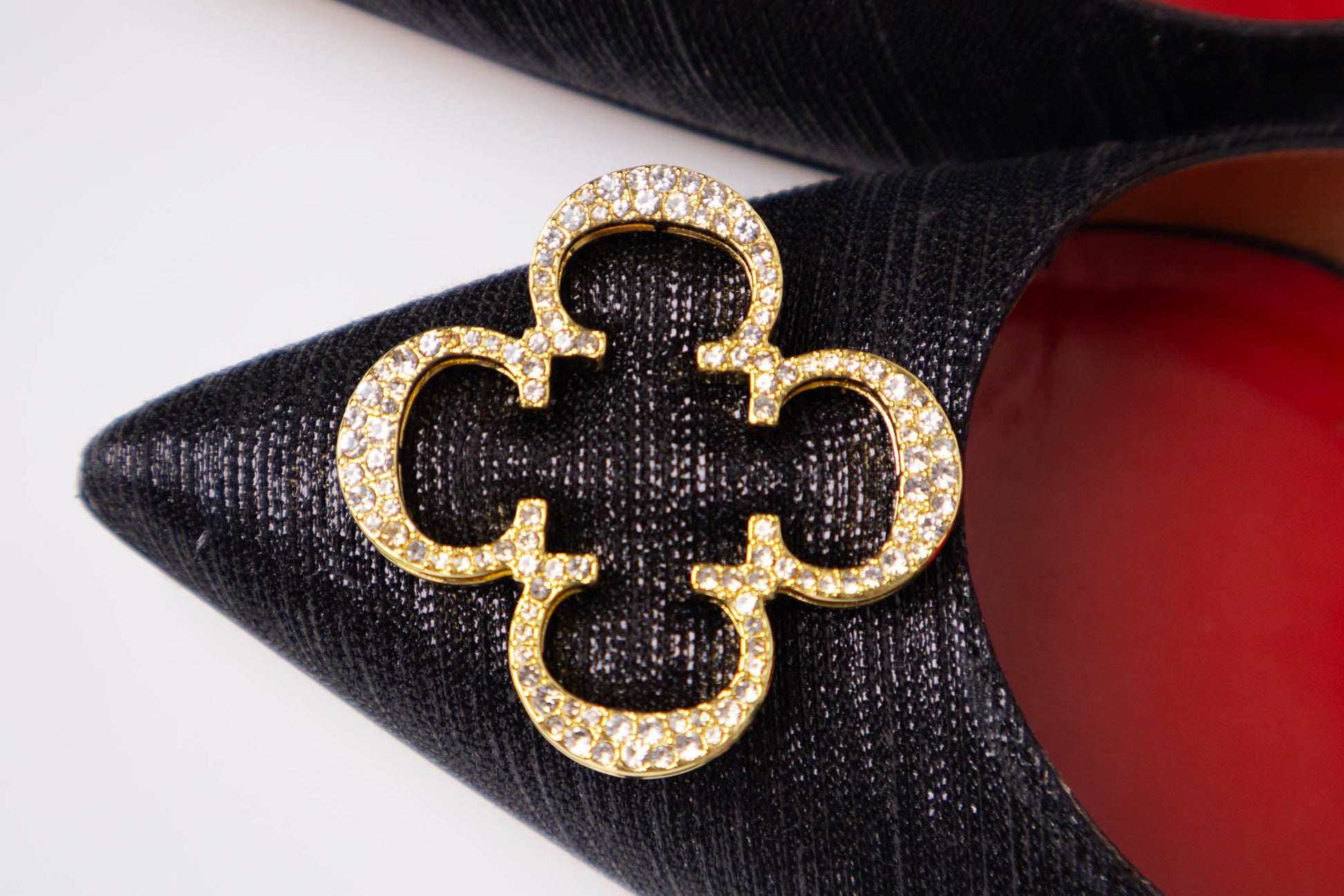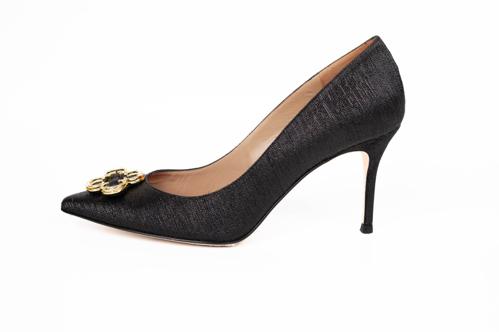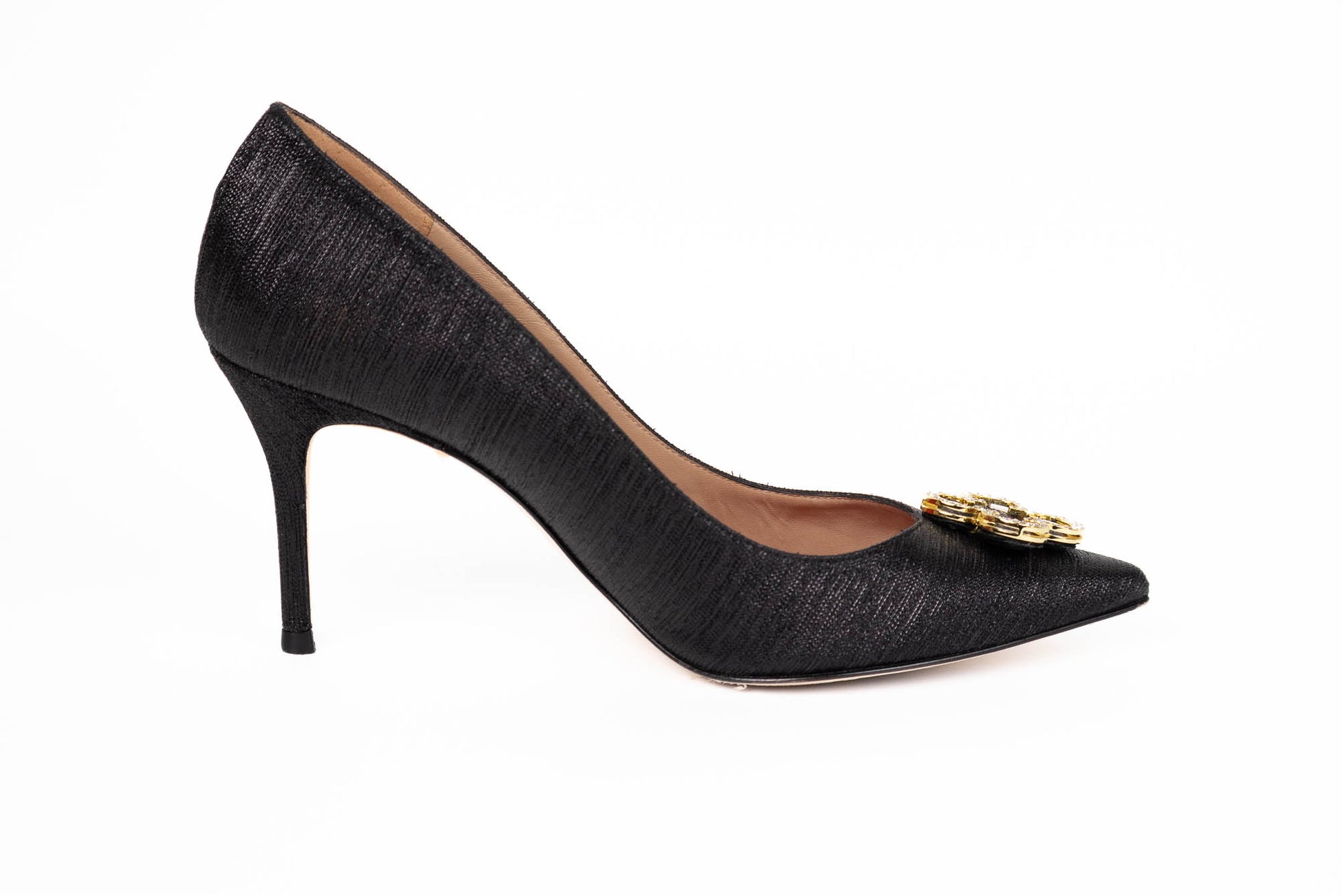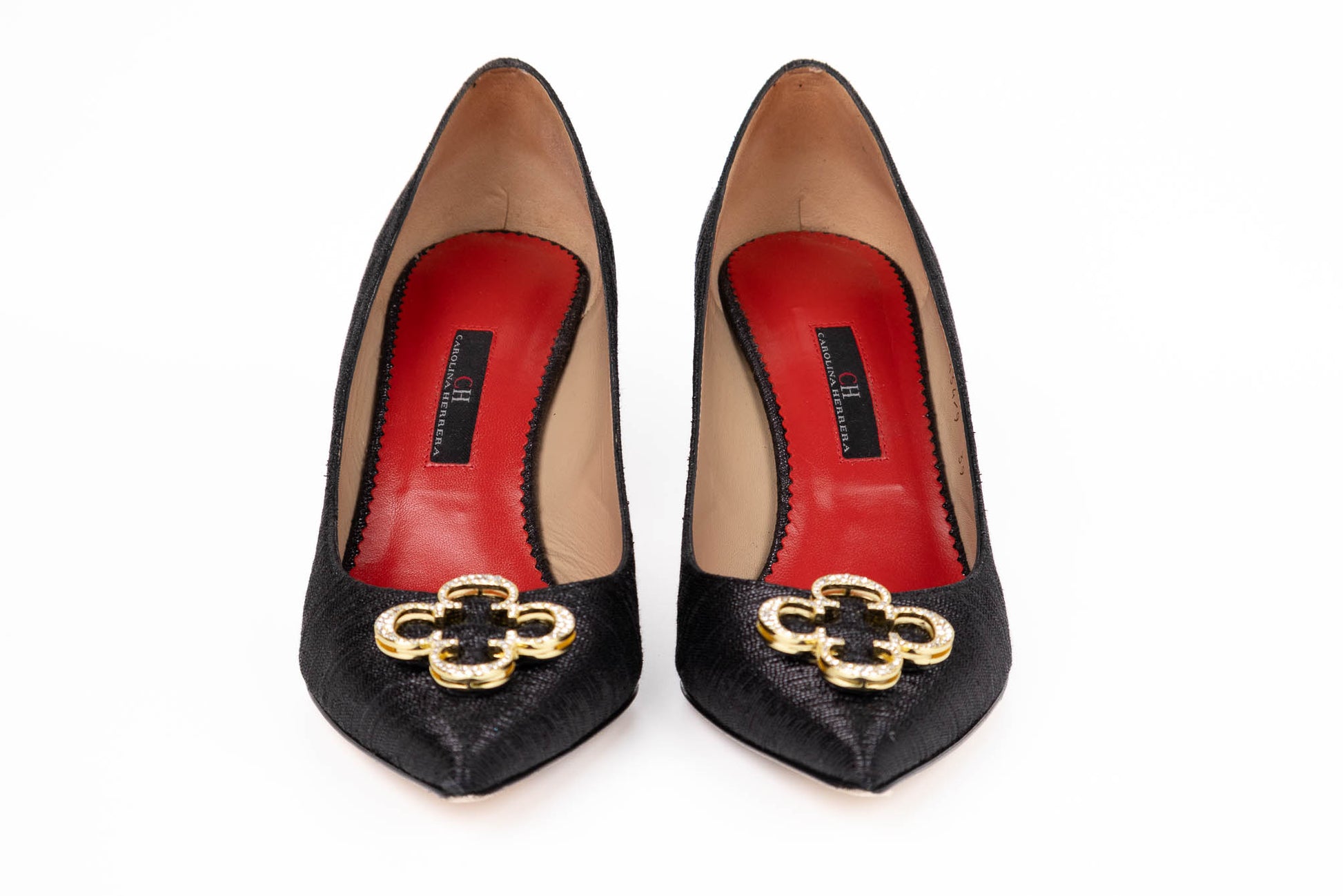 Zapatos forrados en tejido negro brillantes con detalle de Rosetta Insignia formada por cuatro iniciales doradas de CH en forma de flor con cristales incrustados. El interior está forrado en piel color rojo. Posee un tacón de 8 cm.