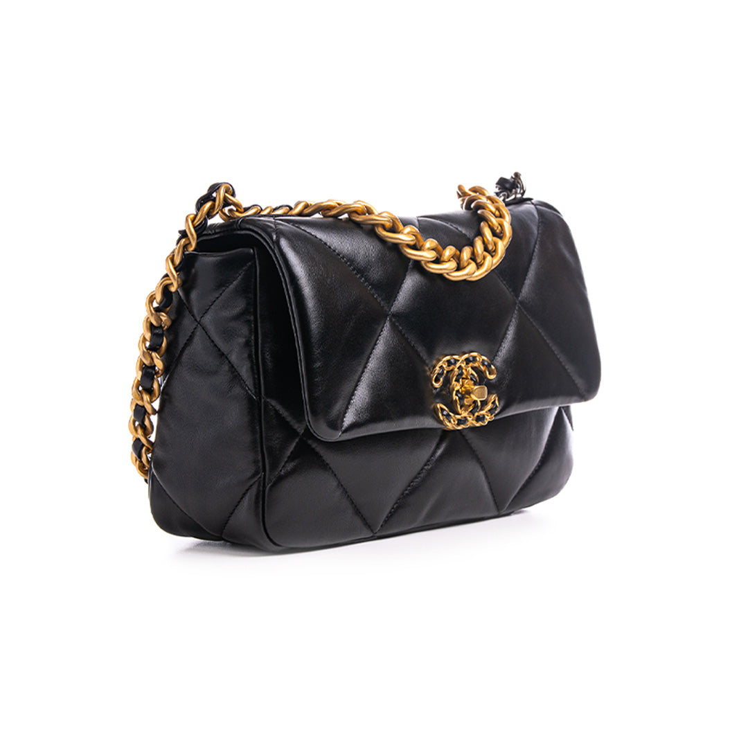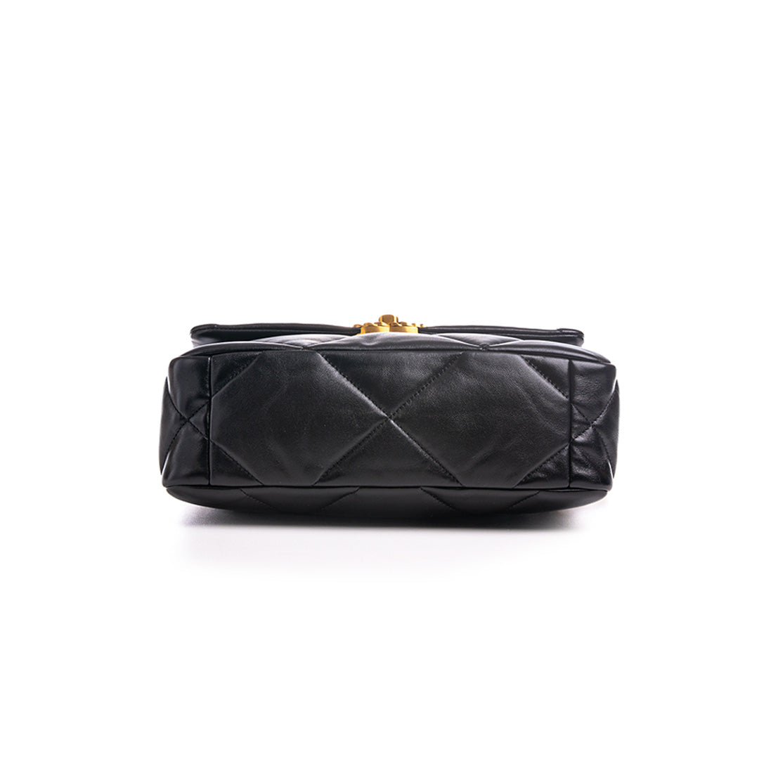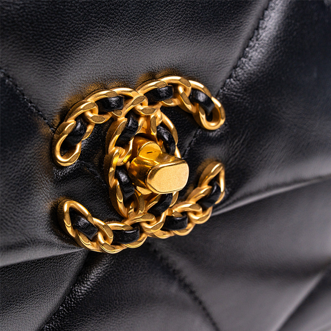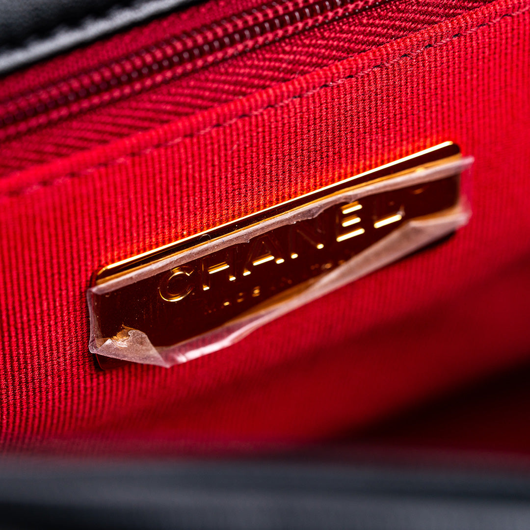 Bolso confeccionado en Goatskin acolchado negro con cadena que combina acabados plateados, rutenio y oro envejecido con cuero entrelazado. Posee un amplio bolsillo con cierre de broche en su parte posterior y en su interior de tela roja tiene un bolsillo de zipper. El cierre de la cartera es de doble C giratorio.