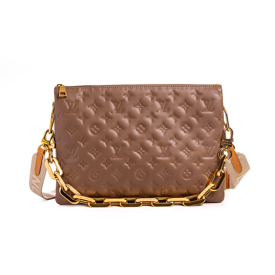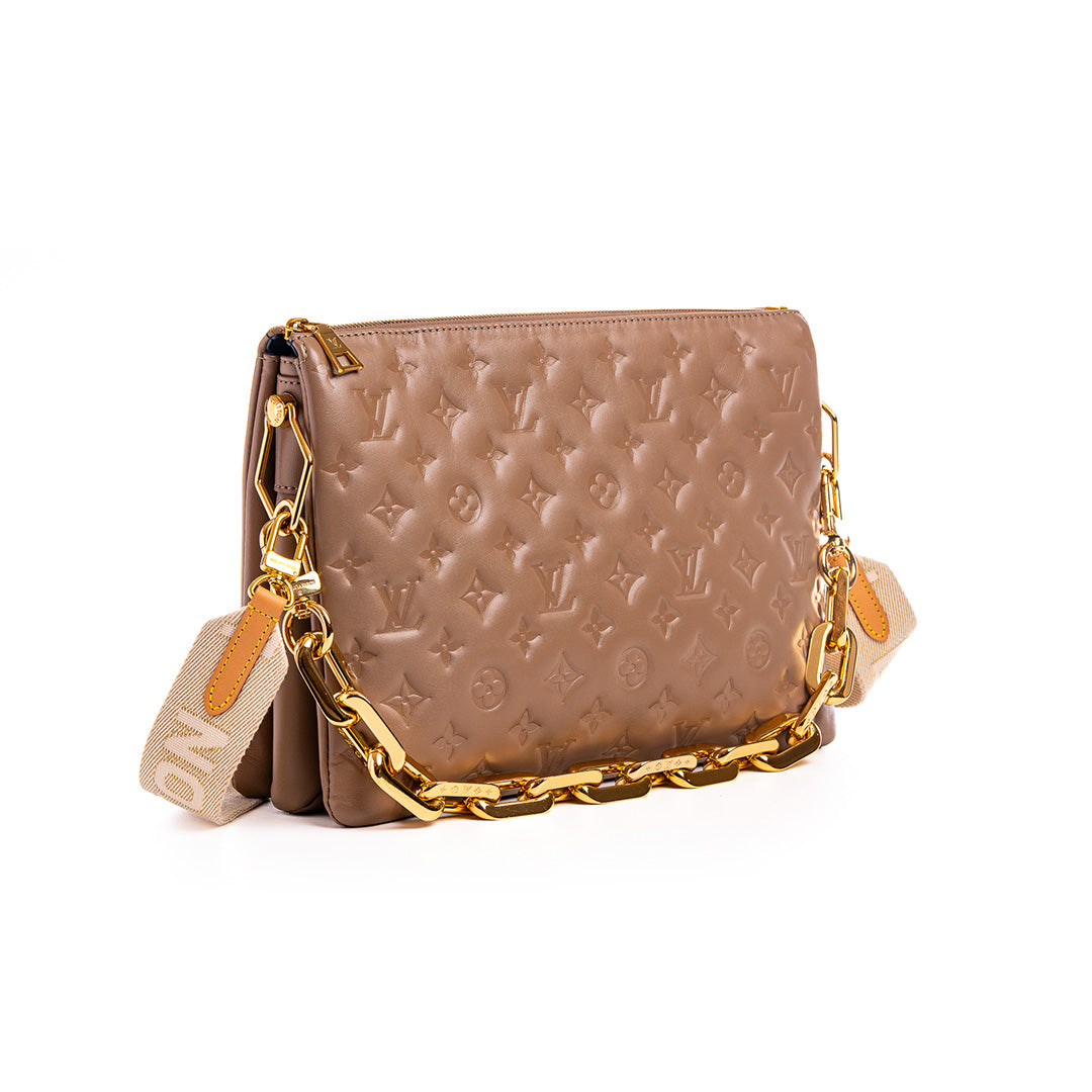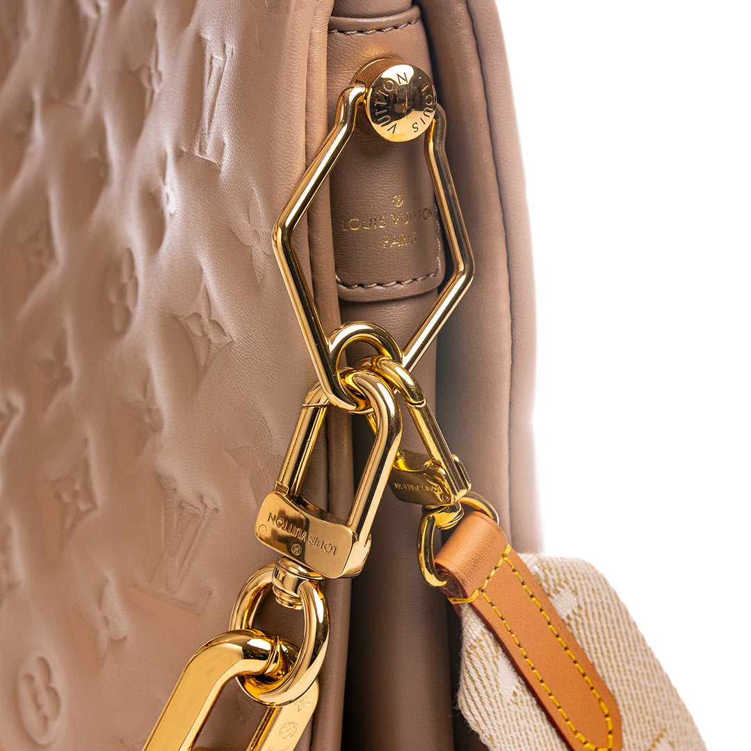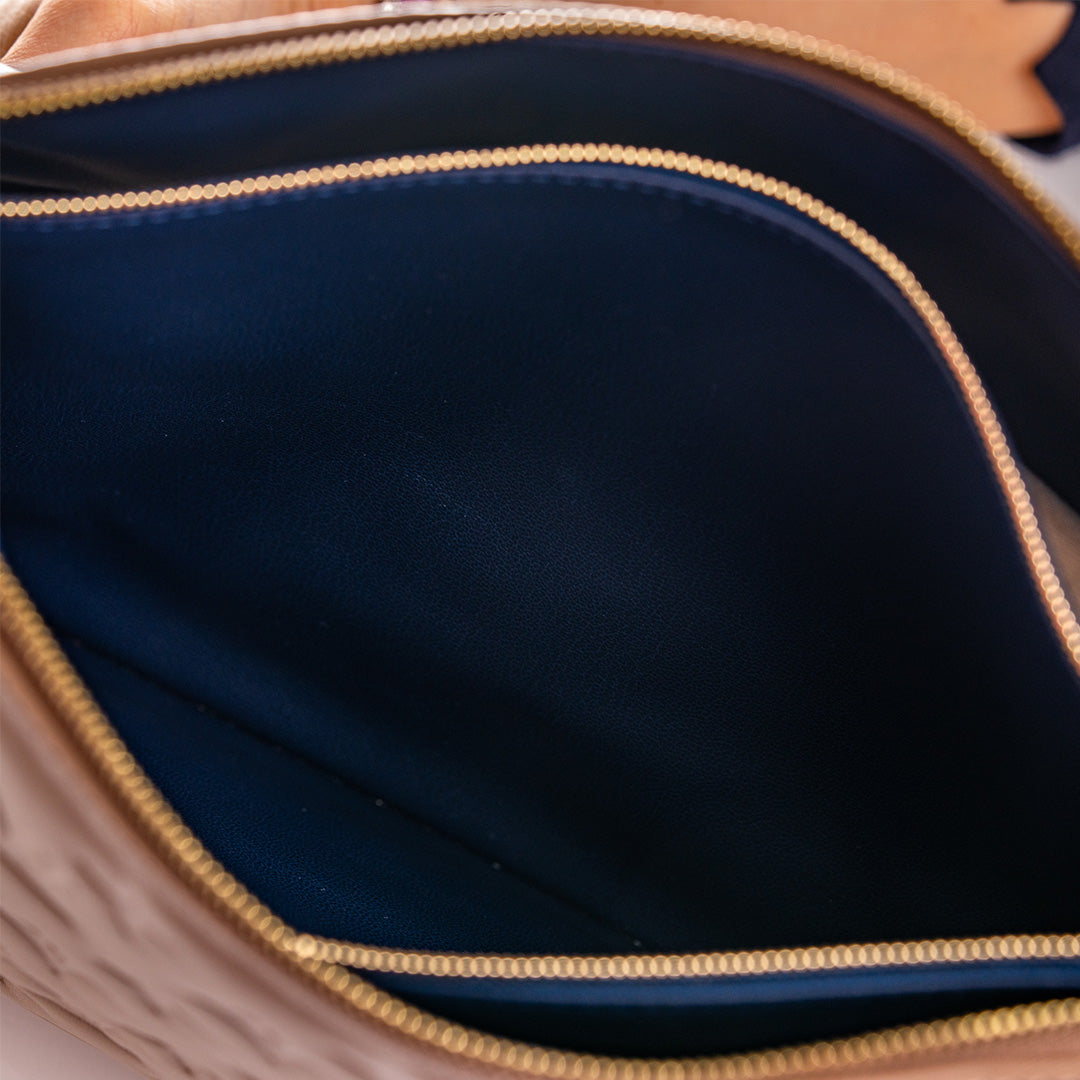 Bolso confeccionado en lambskin beige con un estampado de monograma. Voluminoso, suave y flexible; posee un strap de lona ajustable que permite llevarlo al hombro o como crossbody y una cadena gruesa de estilo moderno que invita a llevarla bajo el brazo. Sus herrajes son dorados y en su interior de tela azul cuenta con tres compartimientos espaciosos donde el central posee zipper.