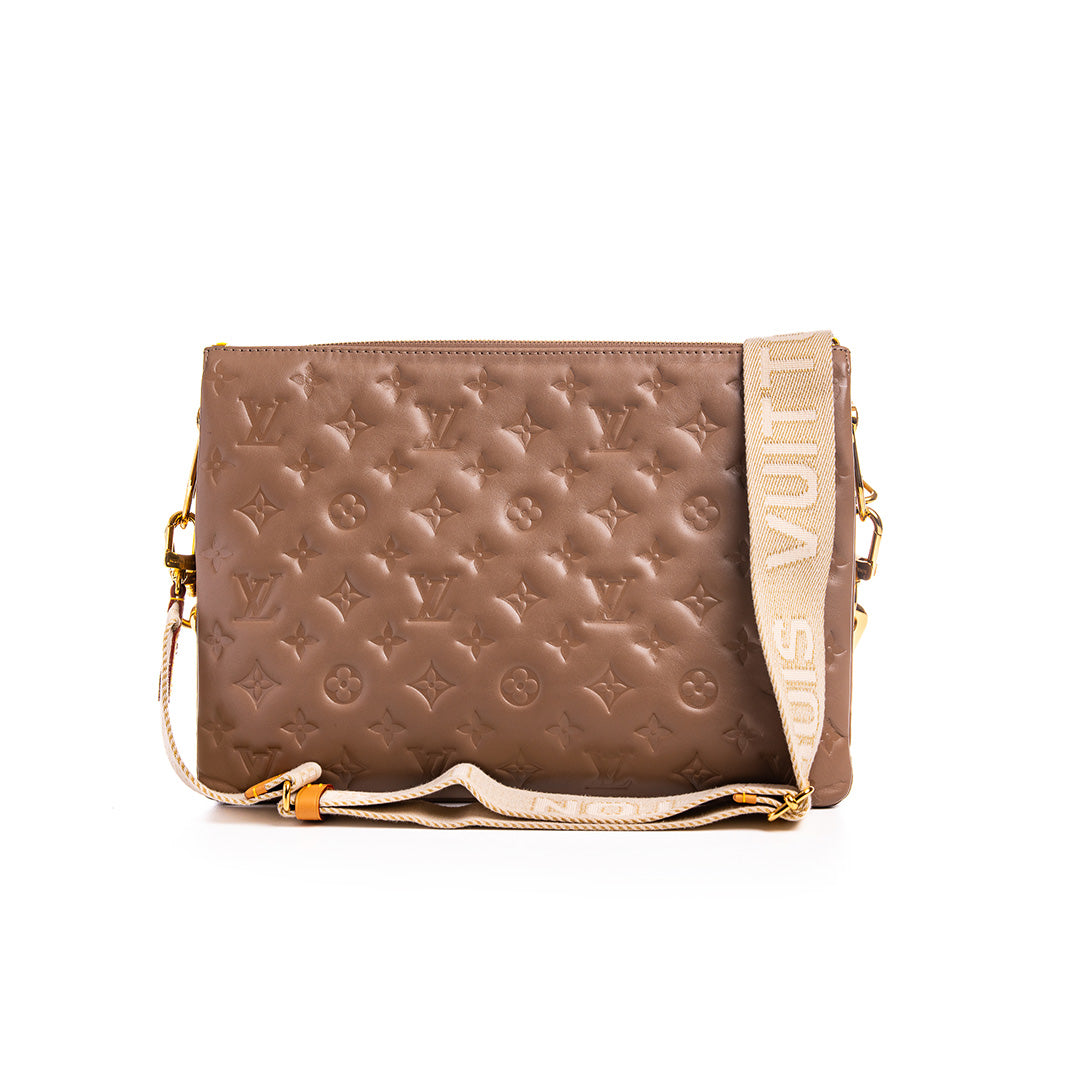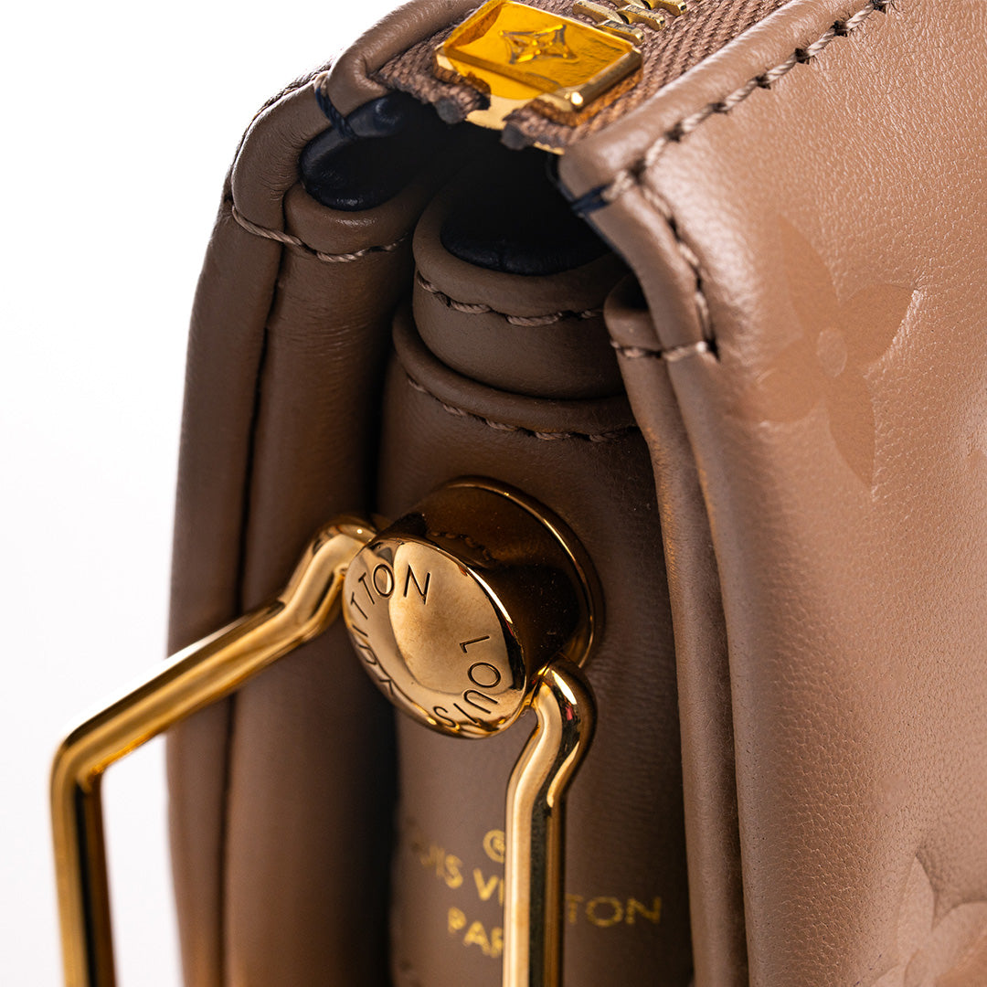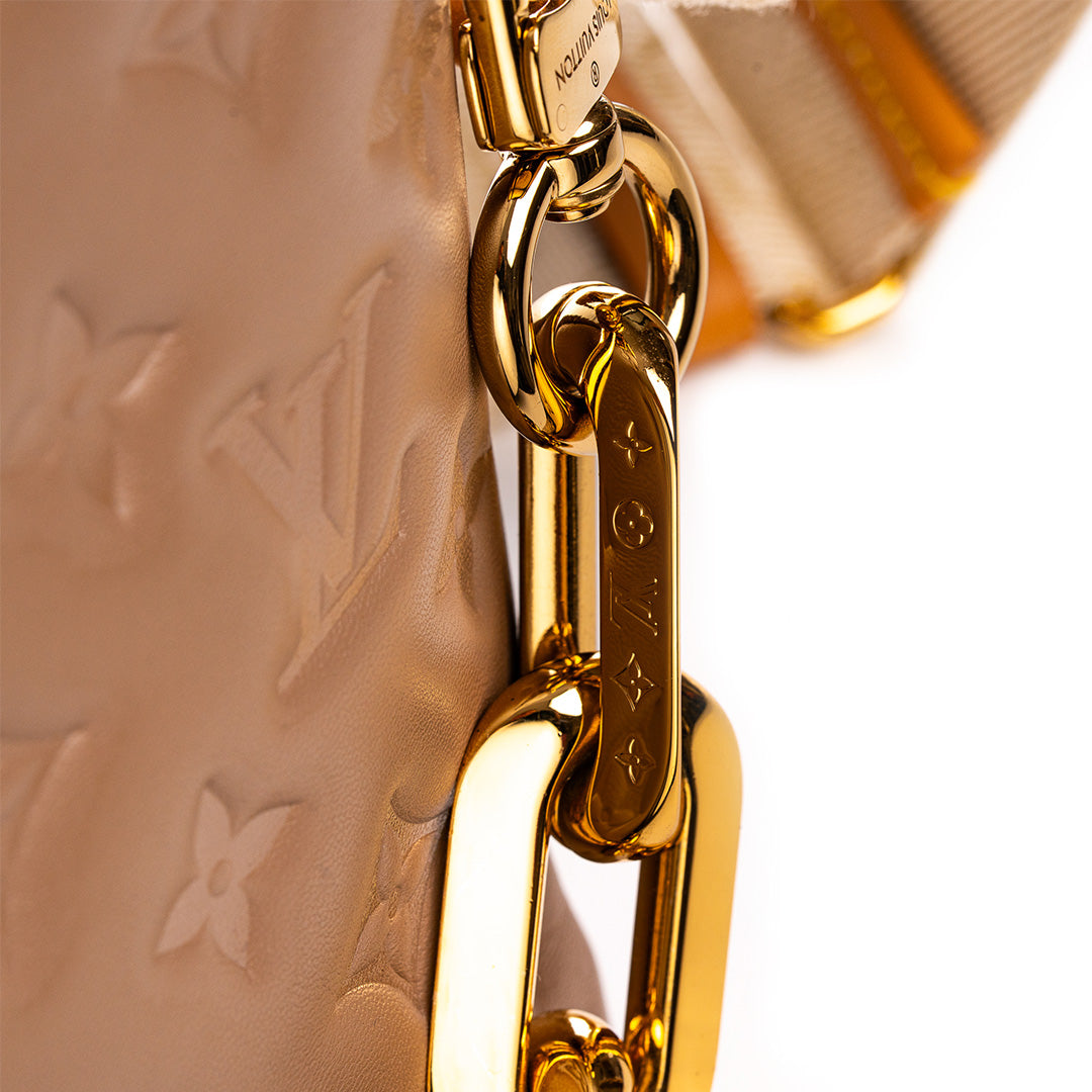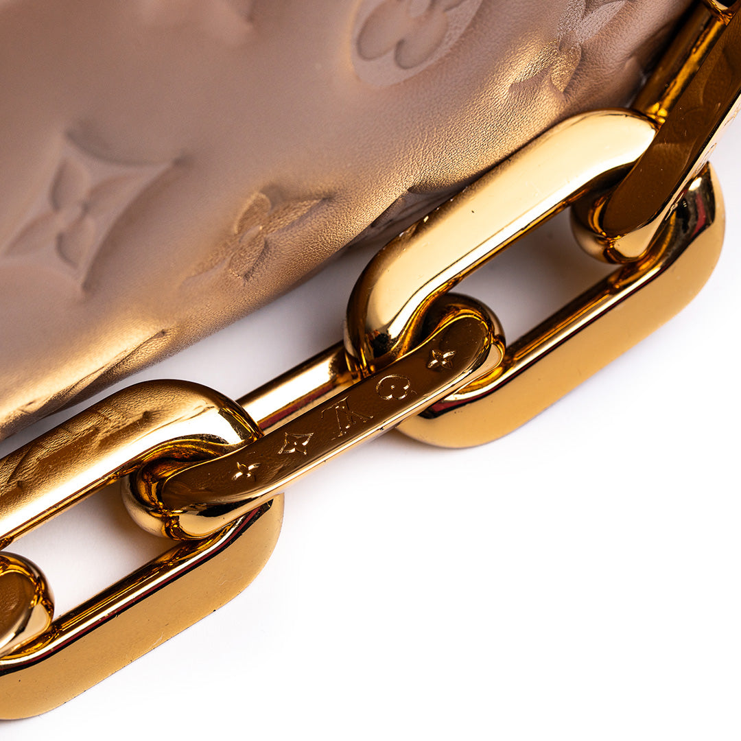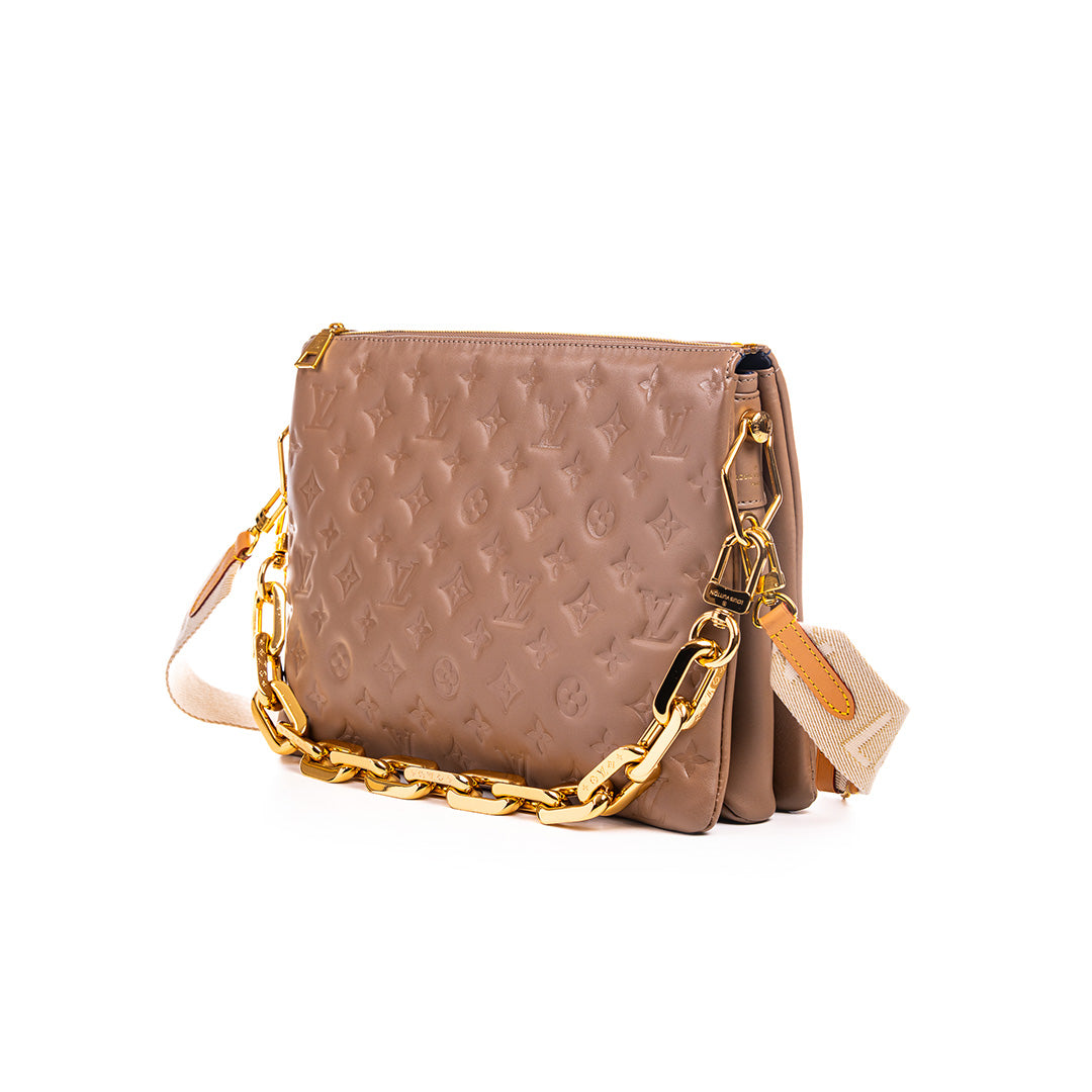 Bolso confeccionado en lambskin beige con un estampado de monograma. Voluminoso, suave y flexible; posee un strap de lona ajustable que permite llevarlo al hombro o como crossbody y una cadena gruesa de estilo moderno que invita a llevarla bajo el brazo. Sus herrajes son dorados y en su interior de tela azul cuenta con tres compartimientos espaciosos donde el central posee zipper.