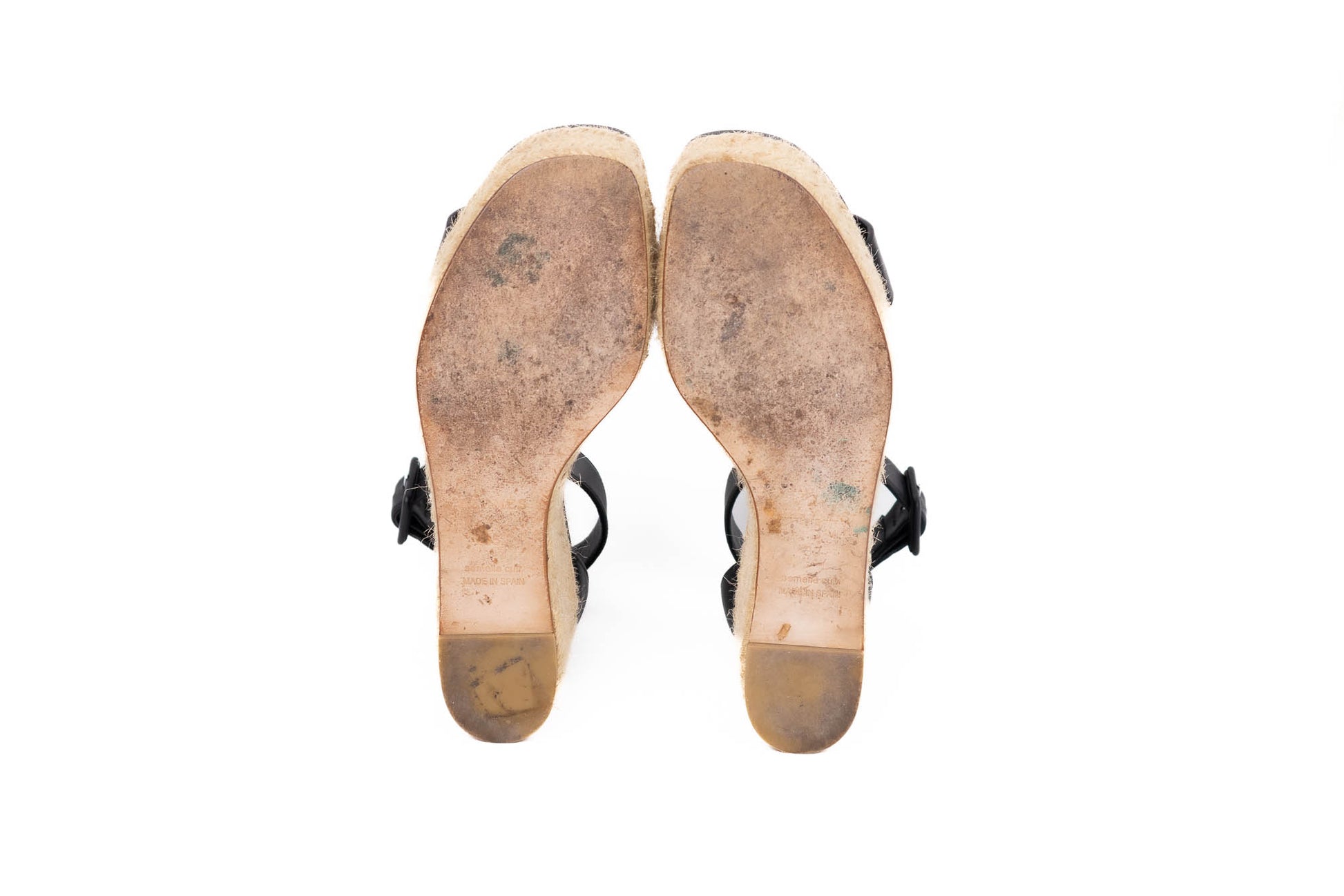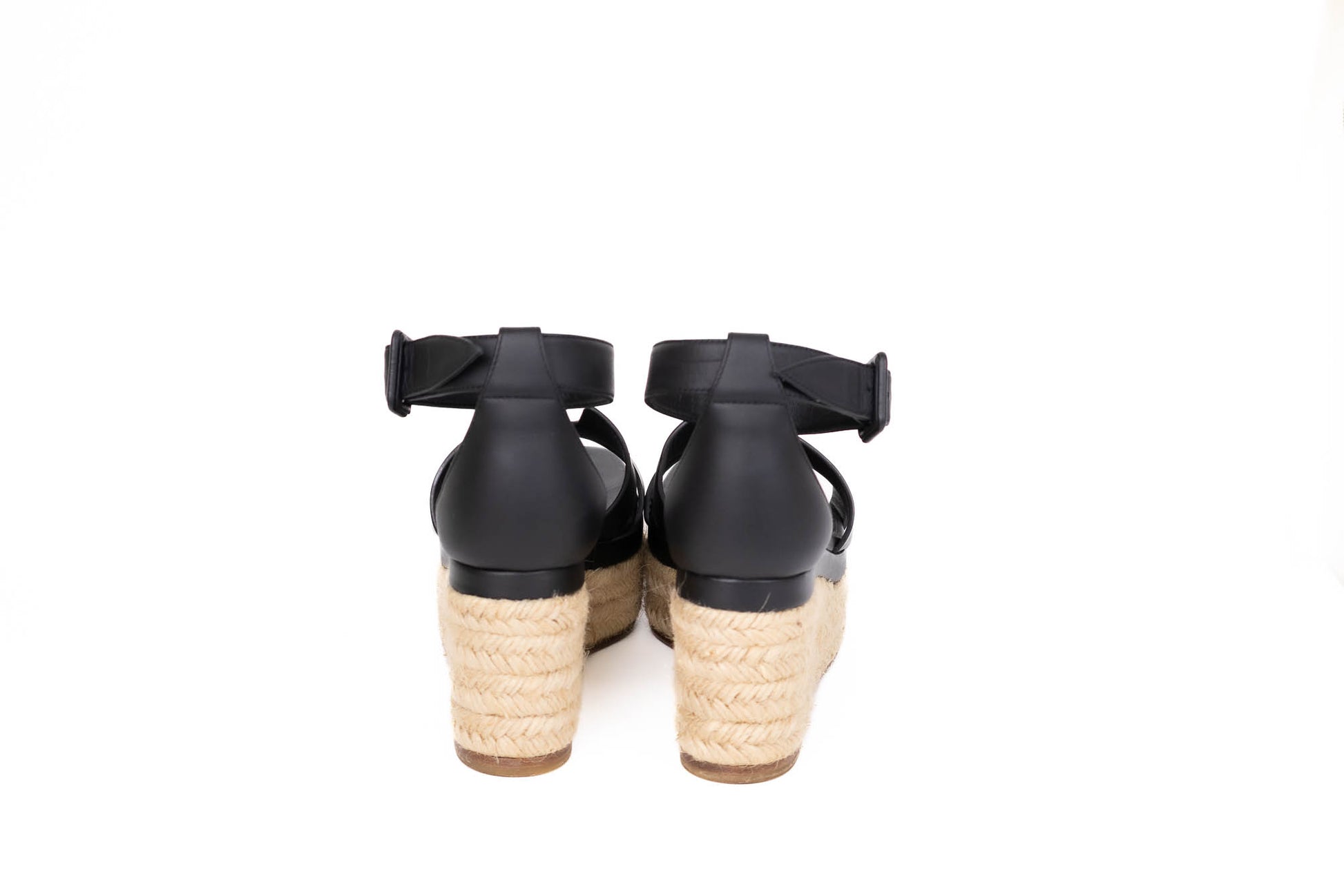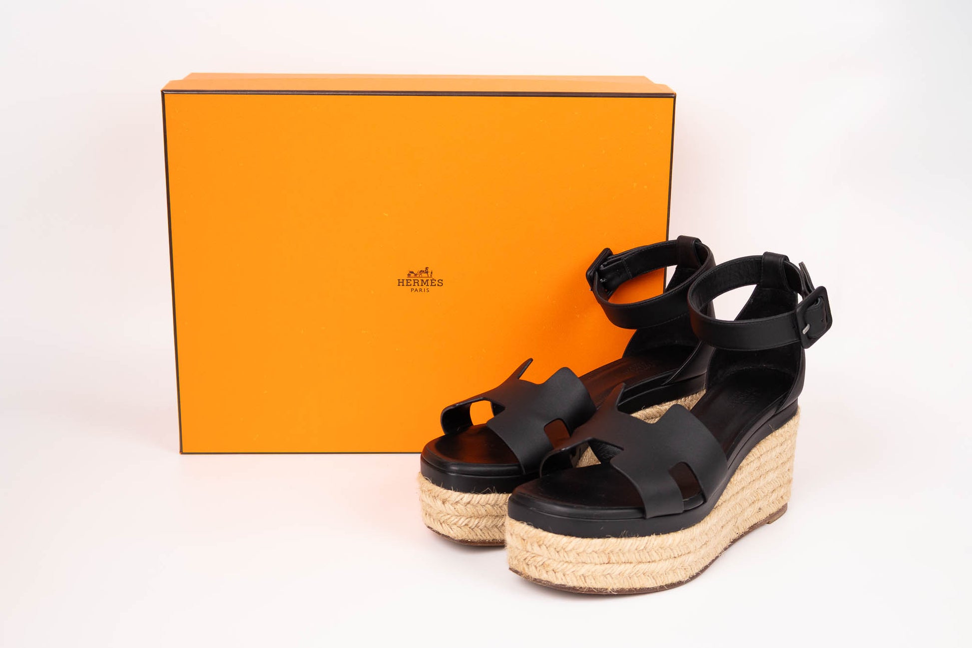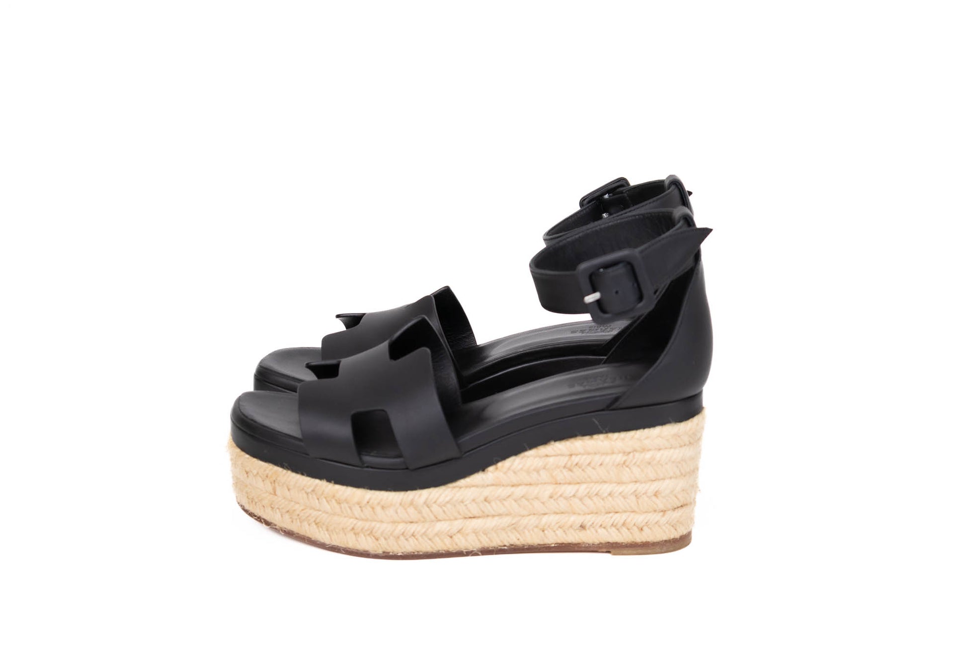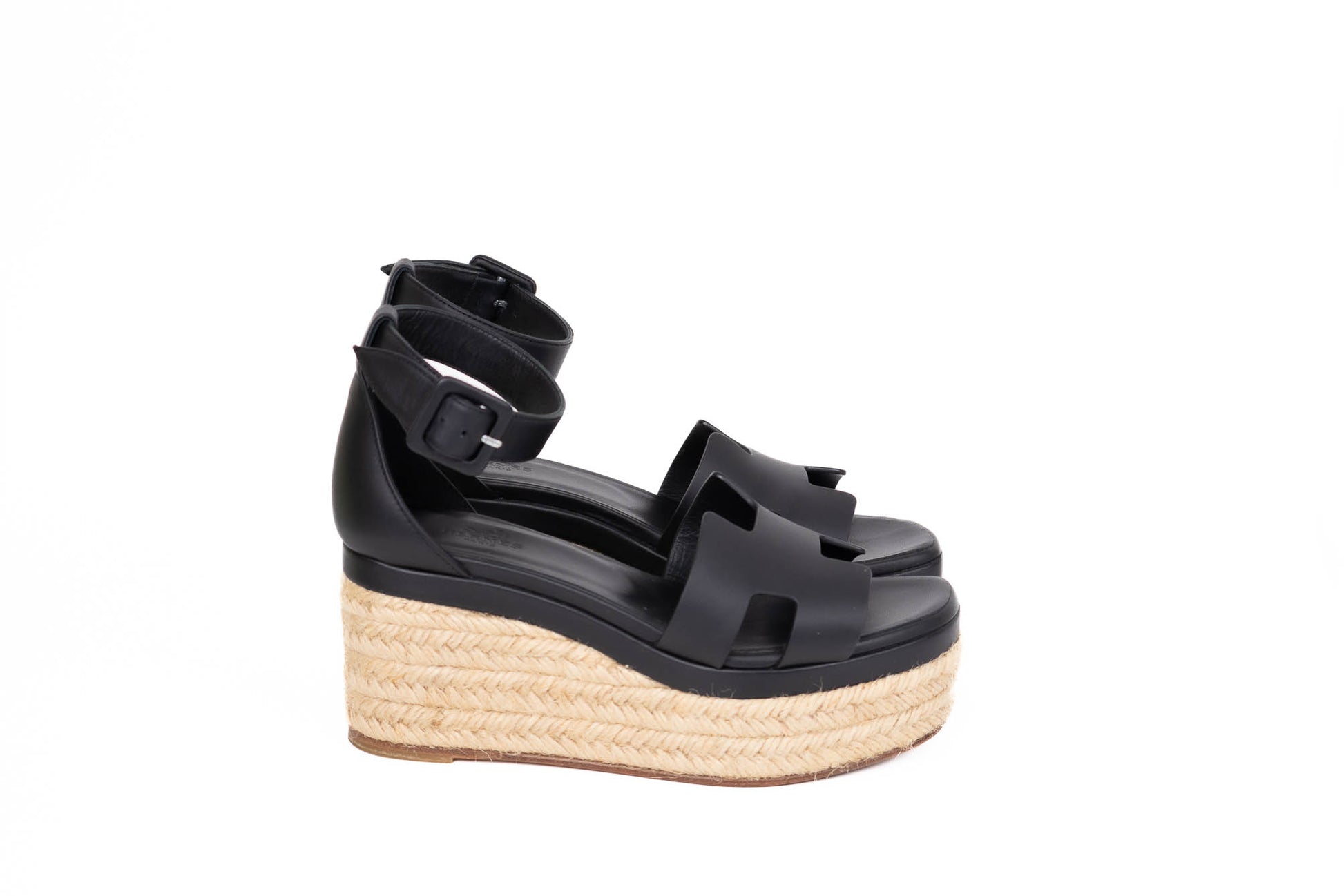 Espadrille de Goatskin con detalle de la H en la parte frontal y tacón de cuerda con cuña. Posee una correa que envuelve el tobillo con hebilla negra.
