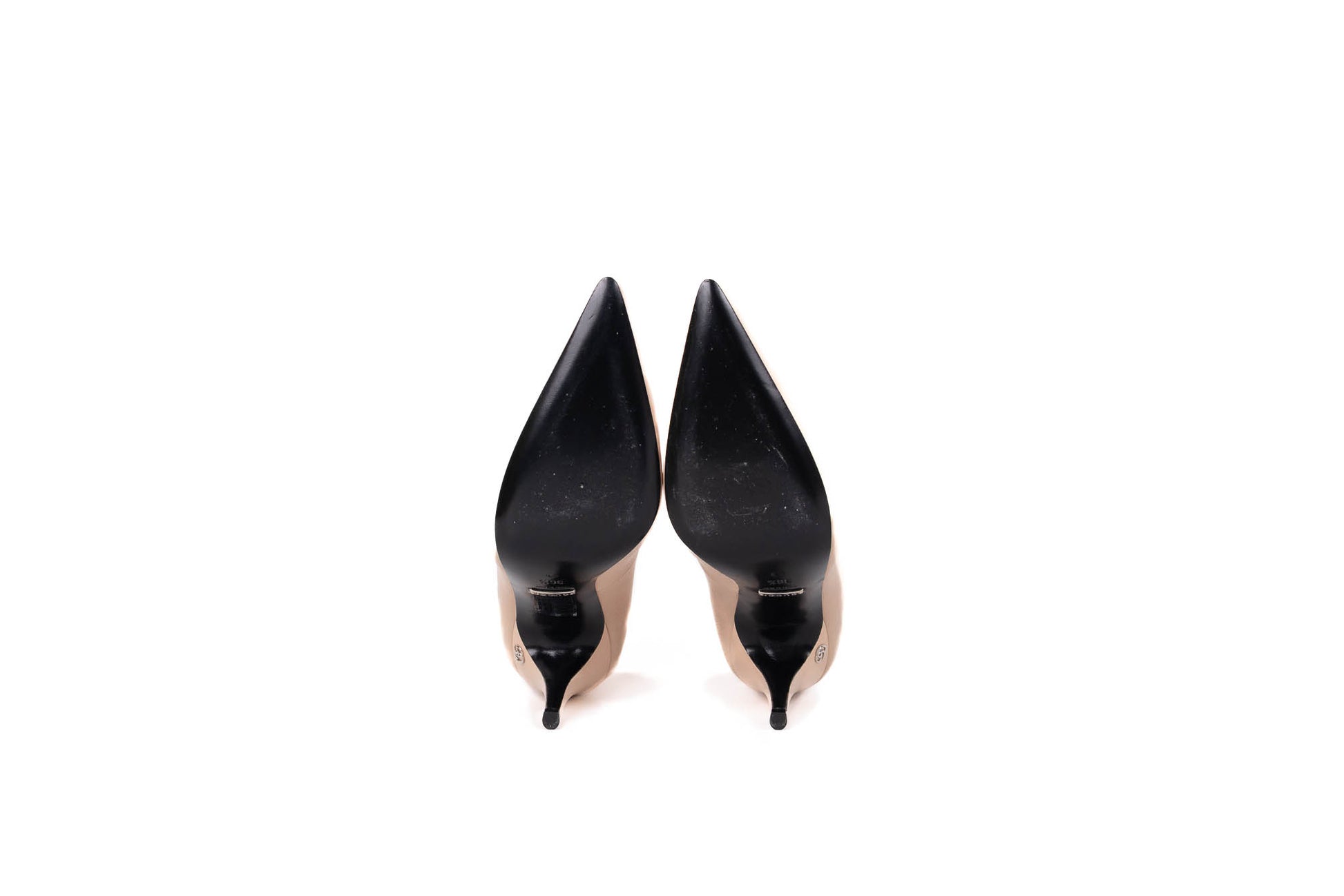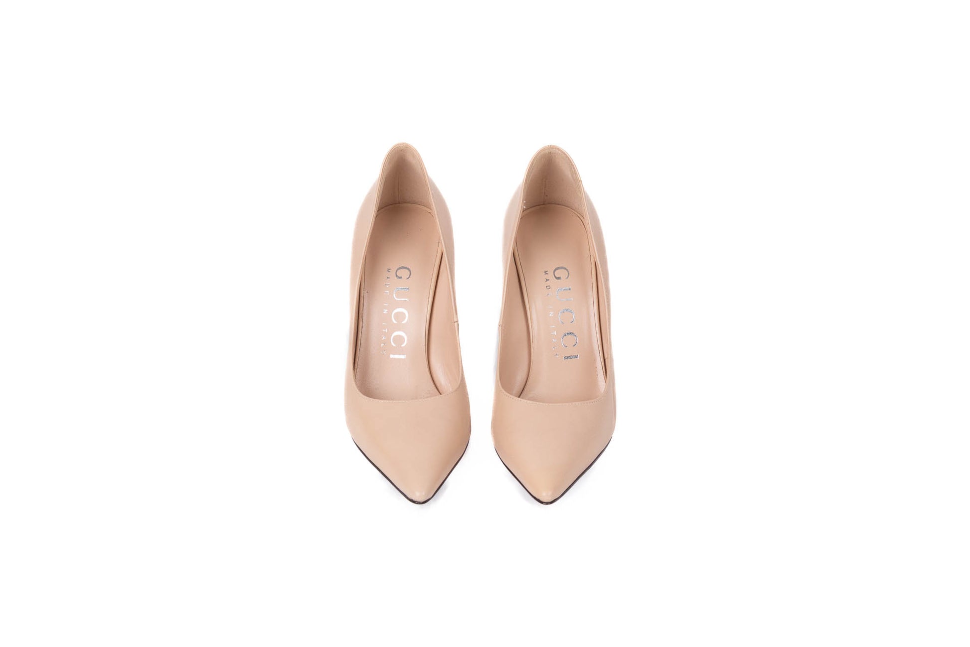 Zapatos de tacón en color nude con diseño de punta fina. Fabricados en Italia. Cuentan con interior estampado con el logotipo de la marca GUCCI. El material exterior tiene un acabado liso y el diseño es clásico.