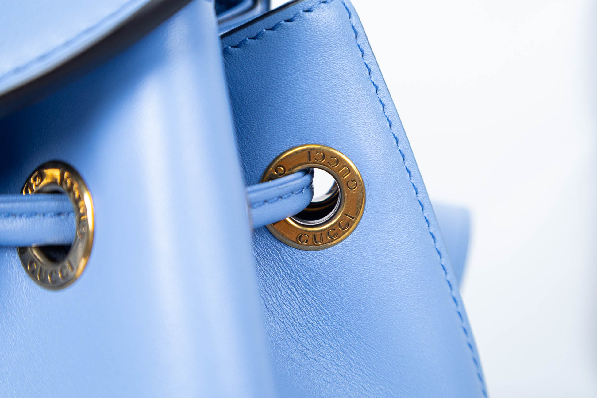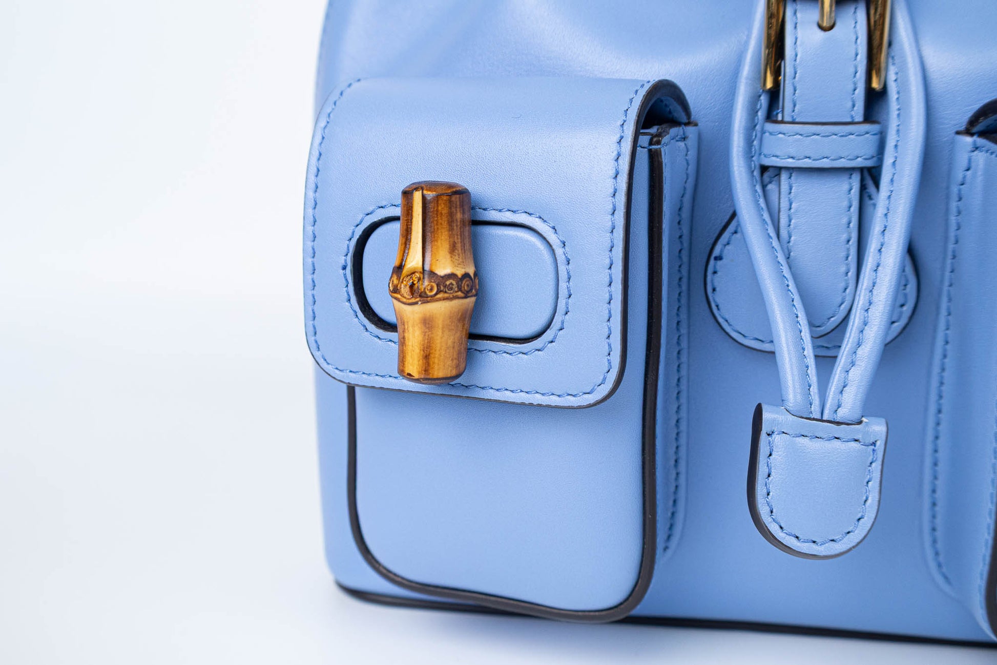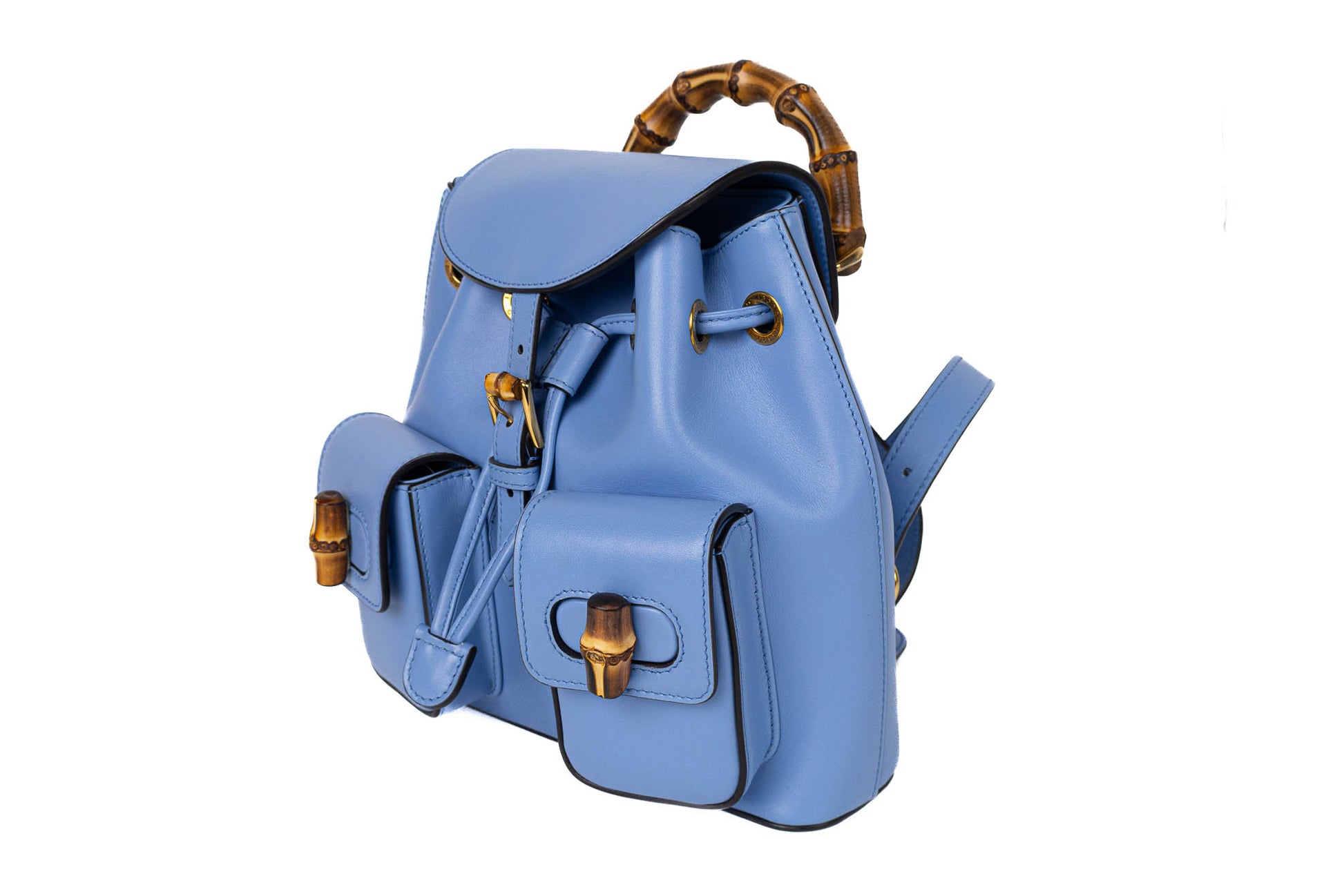 Backpack de cuero liso color Clear Sky Blue de asa superior y cierres de bolsillos exteriores fabricados en bambú natural. Presenta dos bolsillos exteriores frontales con solapa, cierre principal con cordón ajustable, herraje en tono dorado. En su interior de tela tiene un pequeño bolsillo de cuero.