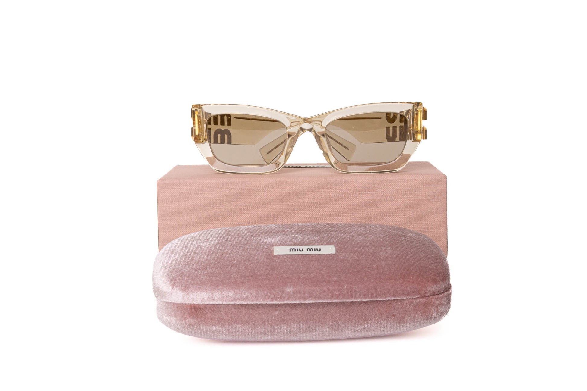 Lentes de acetato de alta calidad, ligeros y resistentes de color arena traslúcido y mica marrones con protección UV. Se aprecia el logotipo Miu Miu de metal de color dorado en ambas patas.
