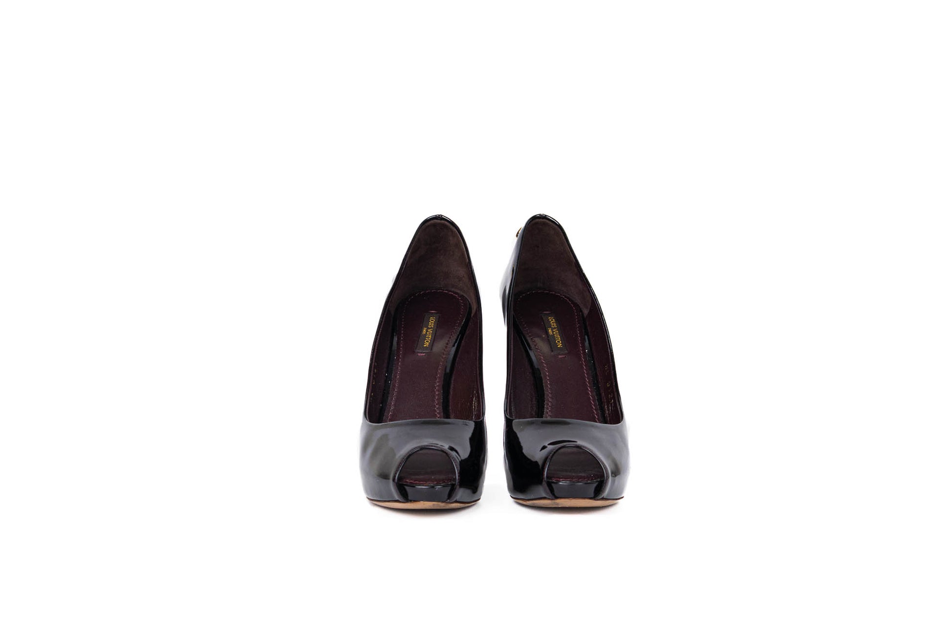 Pumps de patente color burgundy con punta abierta y redondeada. En la parte posterior tiene un candado dorado con el logo de la marca grabado. Su tacón mide 11 cm de alto.
