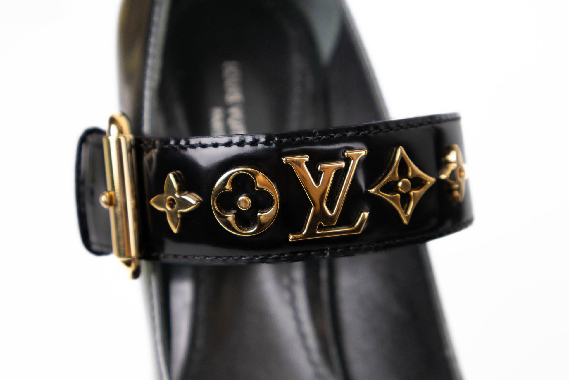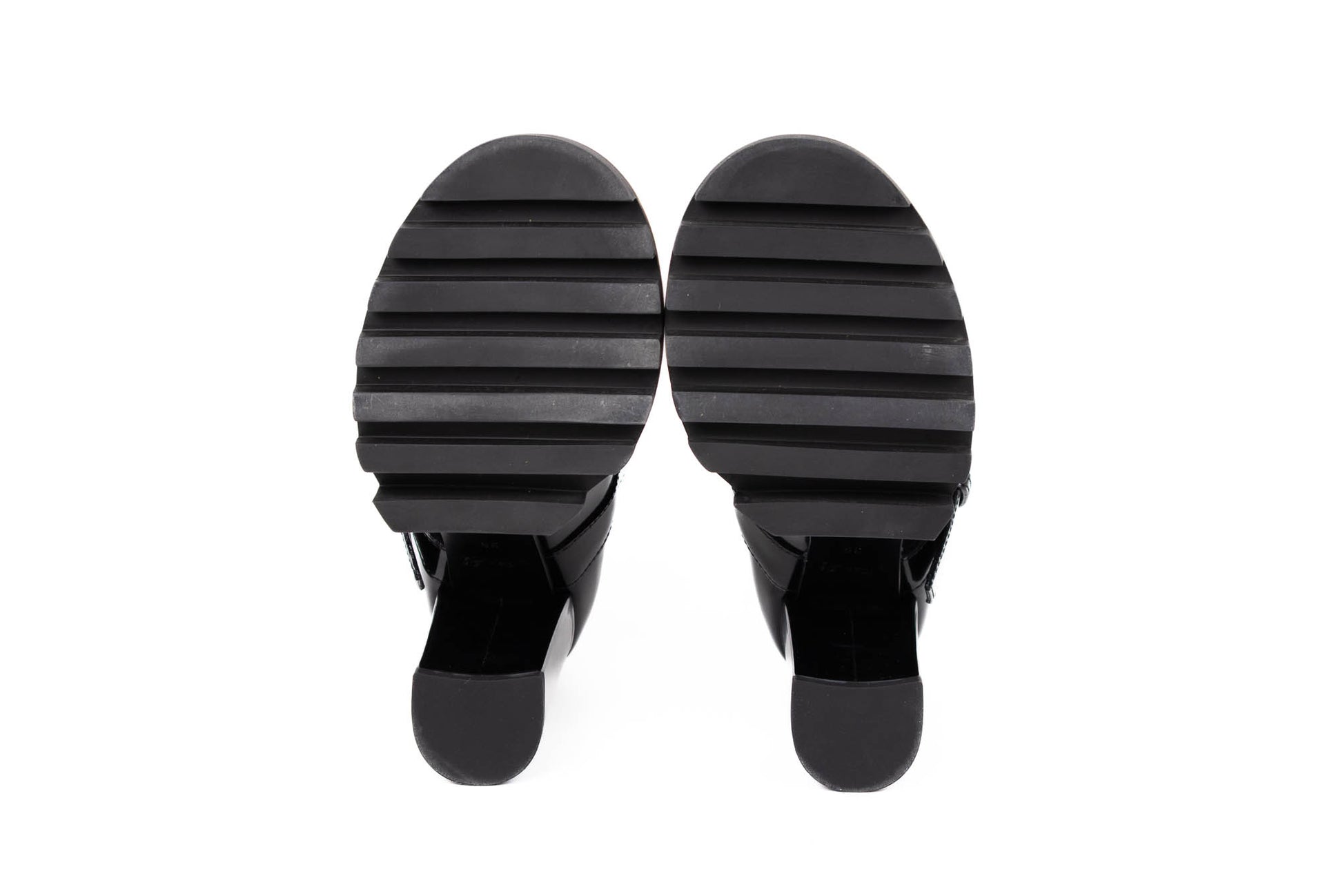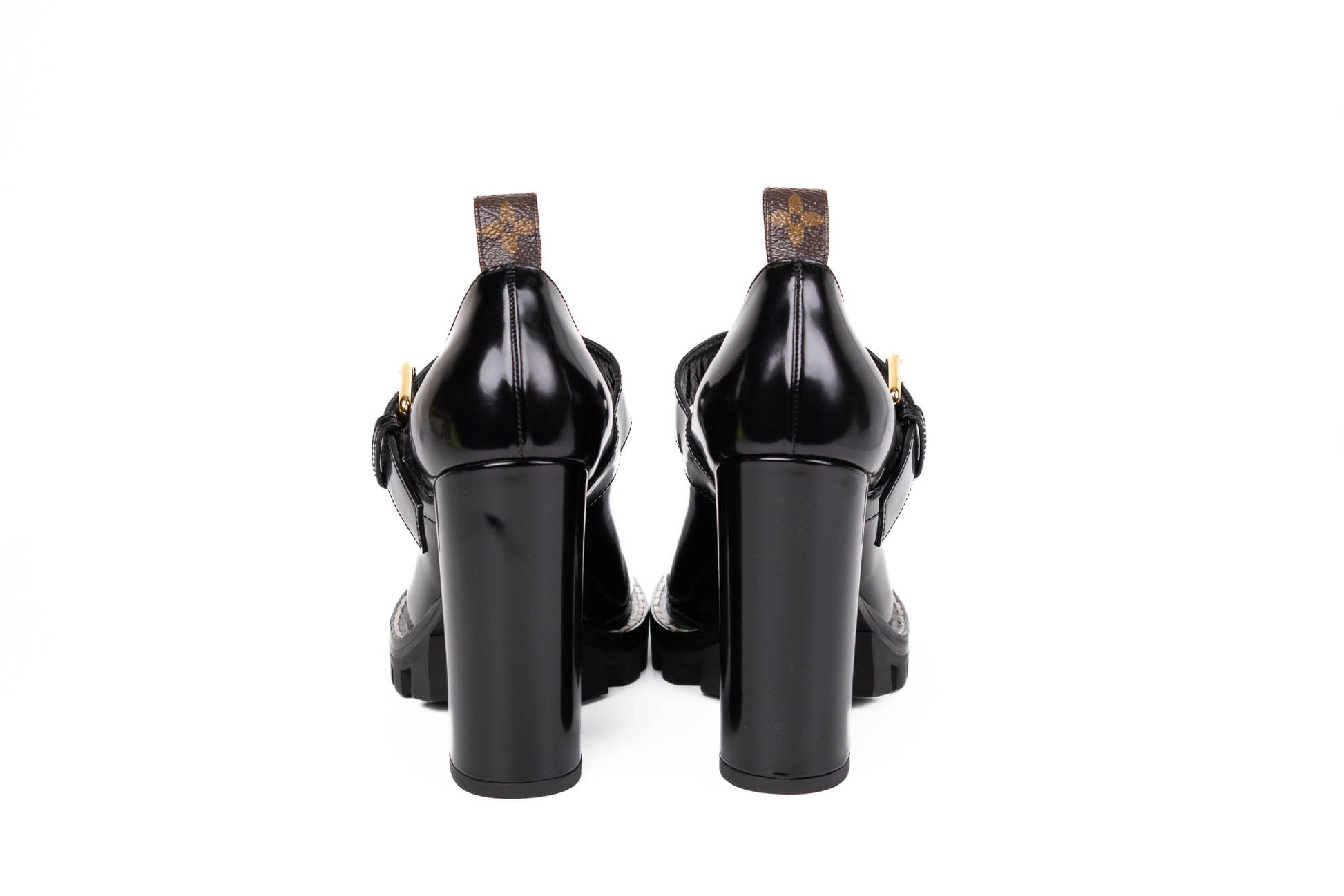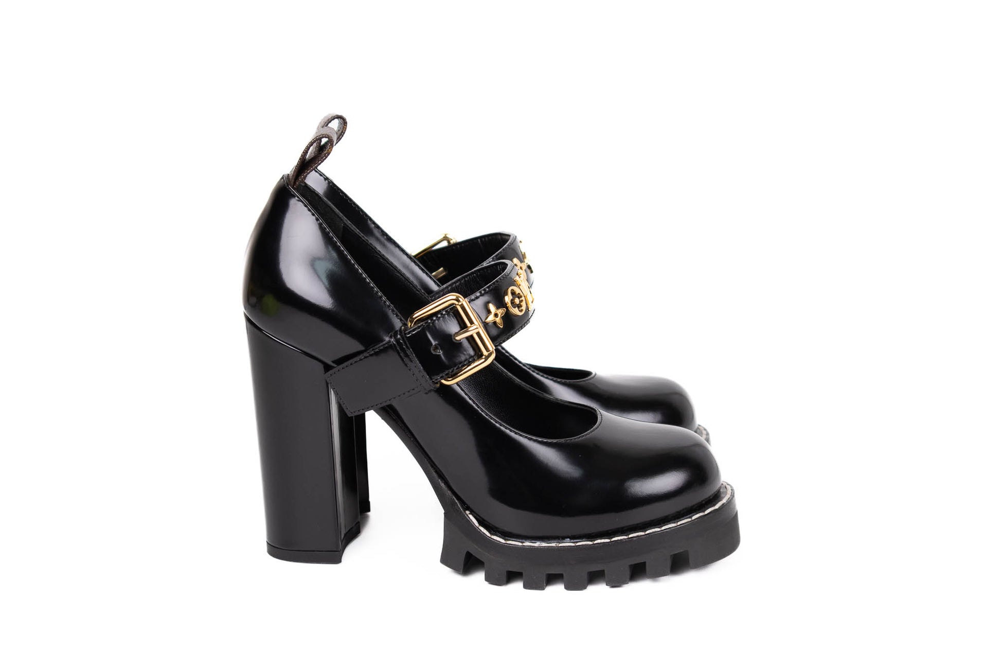 Zapatos de charol negro con tacón ancho y plataforma dentada. Cuentan con una correa en el empeine ajustable con hebilla dorada y detalles metálicos decorativos en forma de símbolos. Diseño cerrado tipo Mary Jane.