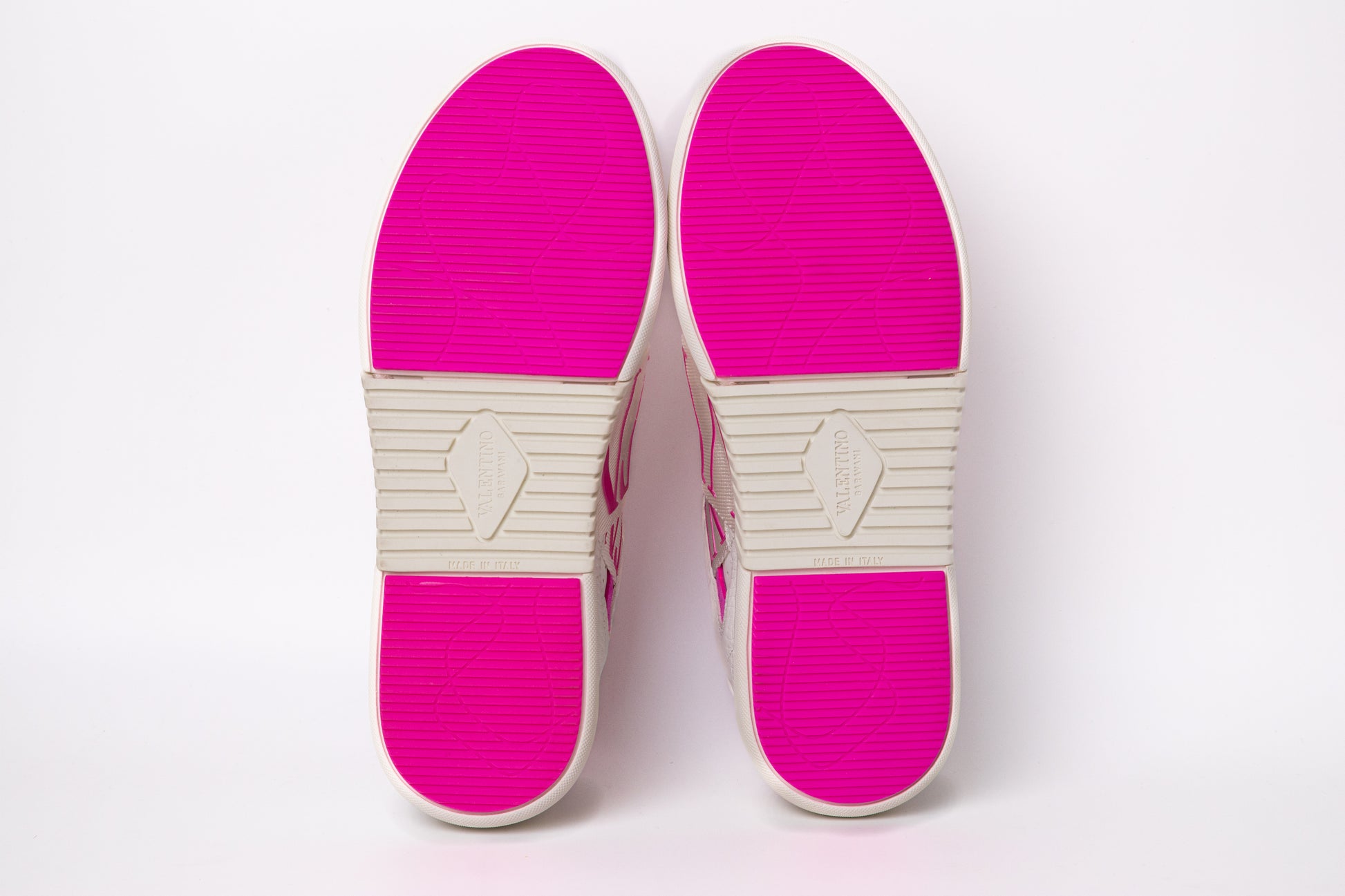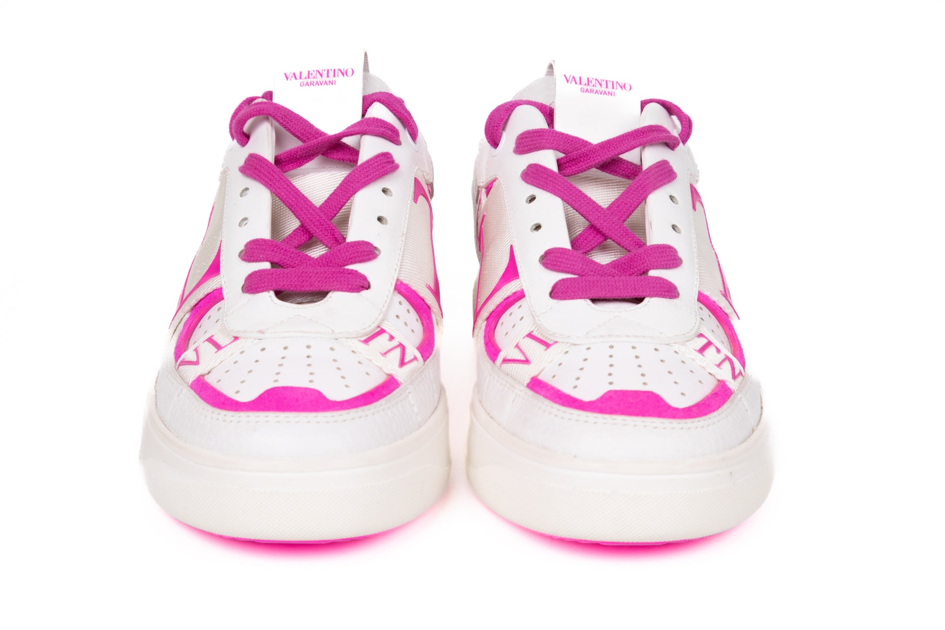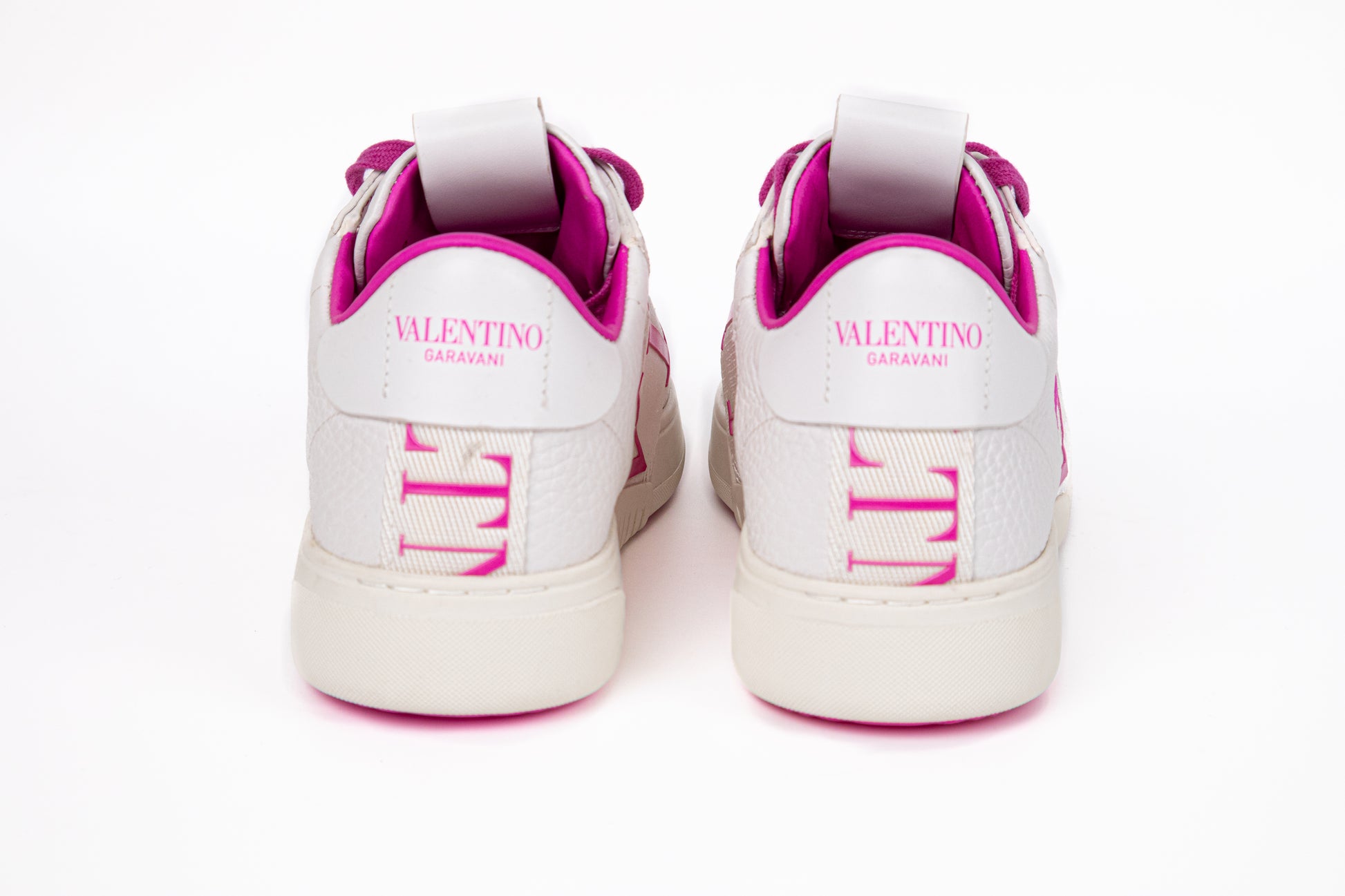 Tenis de diseño moderno en color blanco con detalles en fucsia. Elaborados en cuero y textil, presentan una estructura perforada en la parte frontal para mayor ventilación. Cuentan con cordones fucsia, interior acolchado del mismo tono y suela gruesa de goma en color blanco hueso. En los laterales se observa un diseño gráfico en fucsia, y en la lengüeta lleva el logotipo “VALENTINO GARAVANI” en rosa. Estilo urbano con acabados de alta calidad.