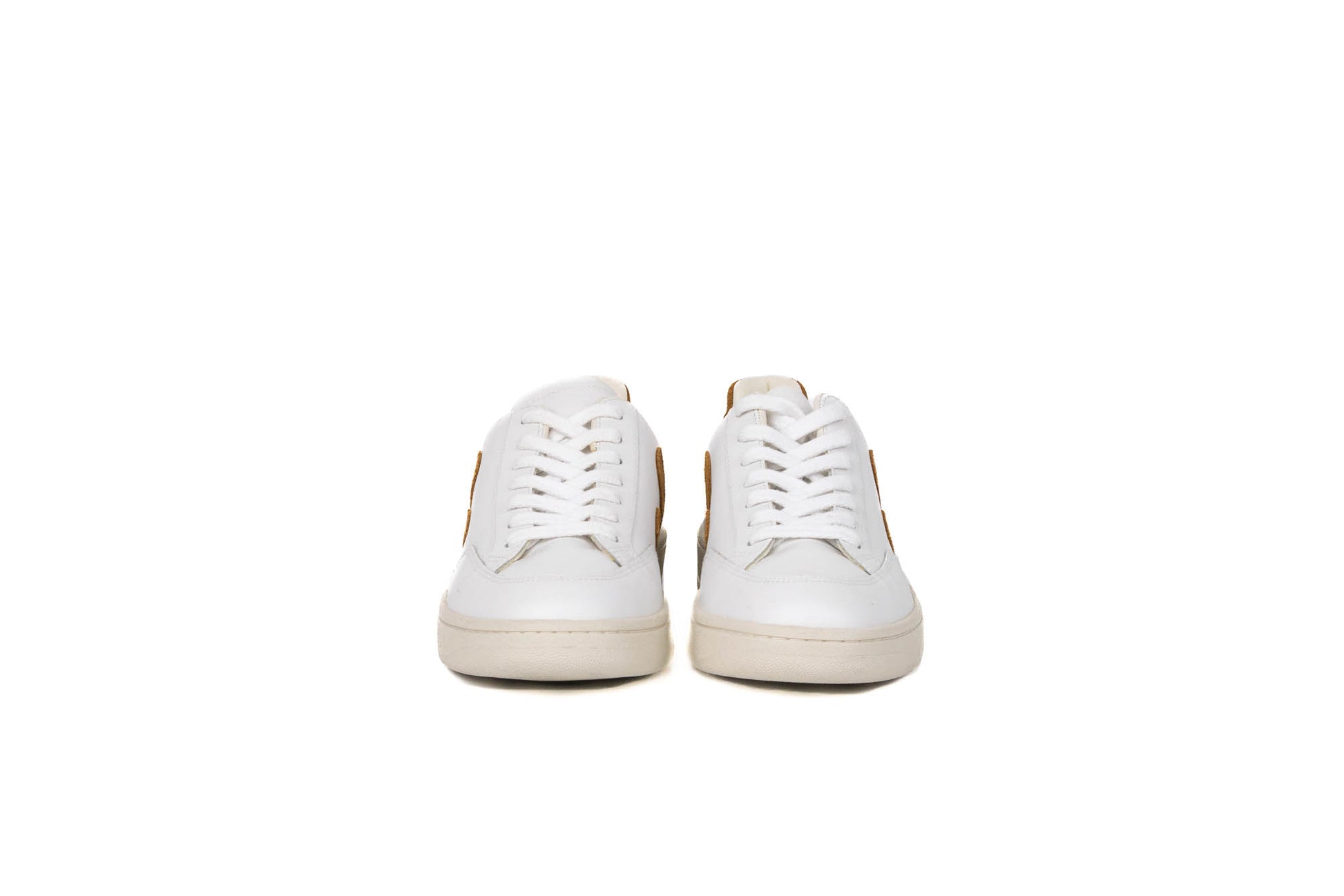 Zapatos confeccionados en cuero blanco con suela de caucho y cordones de algodón. En los laterales tiene una V de suede color camel, mismo material que tiene en la parte posterior donde se puede ver el nombre de la marca.
