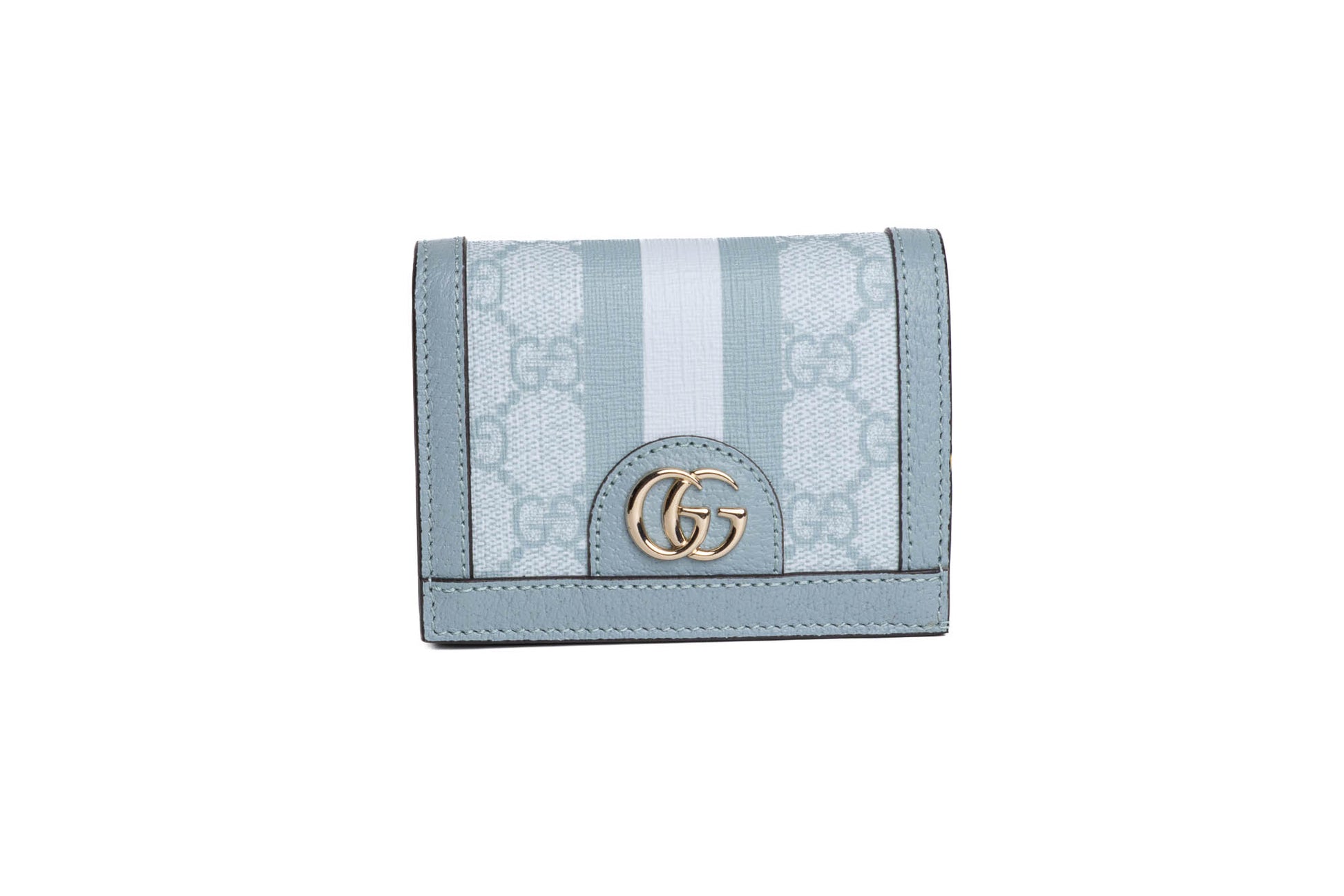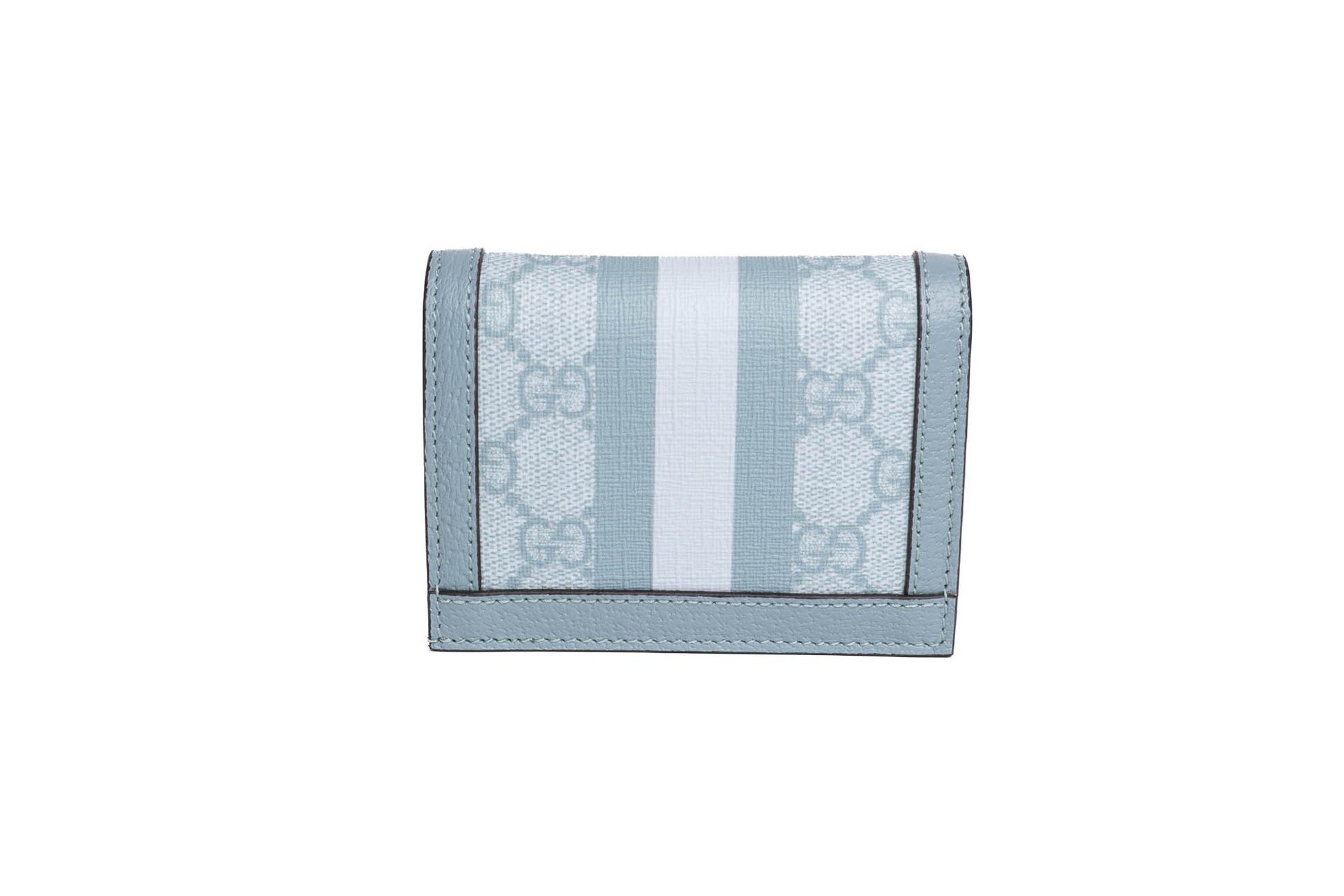 Wallet confeccionado en lona GG supreme con acabados en piel de color azul claro. Su diseño presenta la tribanda web en diferentes tonalidades de azules junto con el emblema de la doble G en metal plateado en la cara frontal. Tiene 5 compartimientos para tarjetas, un bolsillo con zipper para monedas, un compartimiento abierto detrás del bolsillo y otro para colocar billetes. Su cierre es de broche a presión.